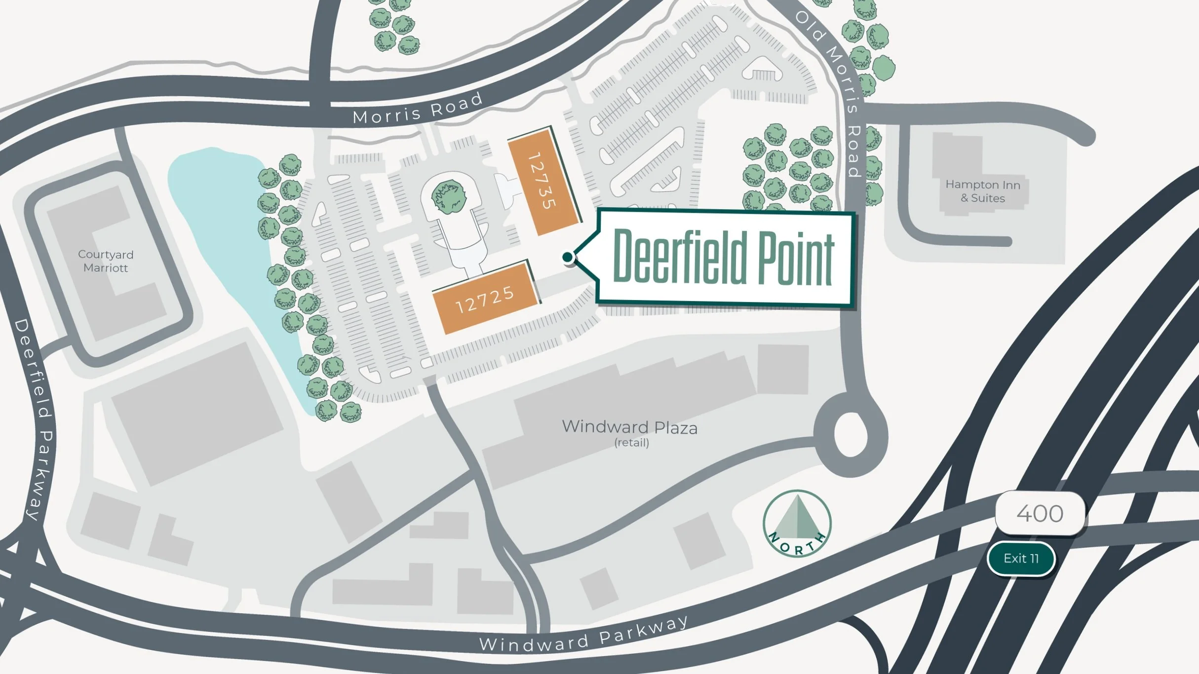Located within immediate proximity of Georgia 400 in the heart of Deerfield Park, Deerfield Point offers the accessibility, presence and an unbeatable walk-to amenity base that North Fulton tenants have come to expect. Set back slightly from Windward Parkway, Deerfield Point provides a secure, park-like atmosphere in the heart of prime in-town access.